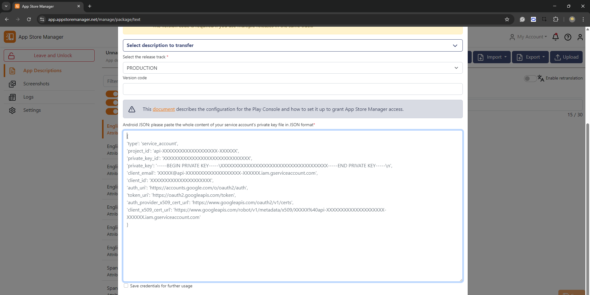 Use the created key file (JSON) within your desired application. Sometimes, you have to upload the whole file, and in the [App Store Manager](https://www.iwantanelephant.com/app-store-management-localization/), you provide only the content of the JSON file. Therefore, open the file with your preferred editor (Notepad++, UltraEdit, or your standard OS editor) and copy the entire content with all brackets. We have configured API access for the App Store Manager by adding the JSON string.