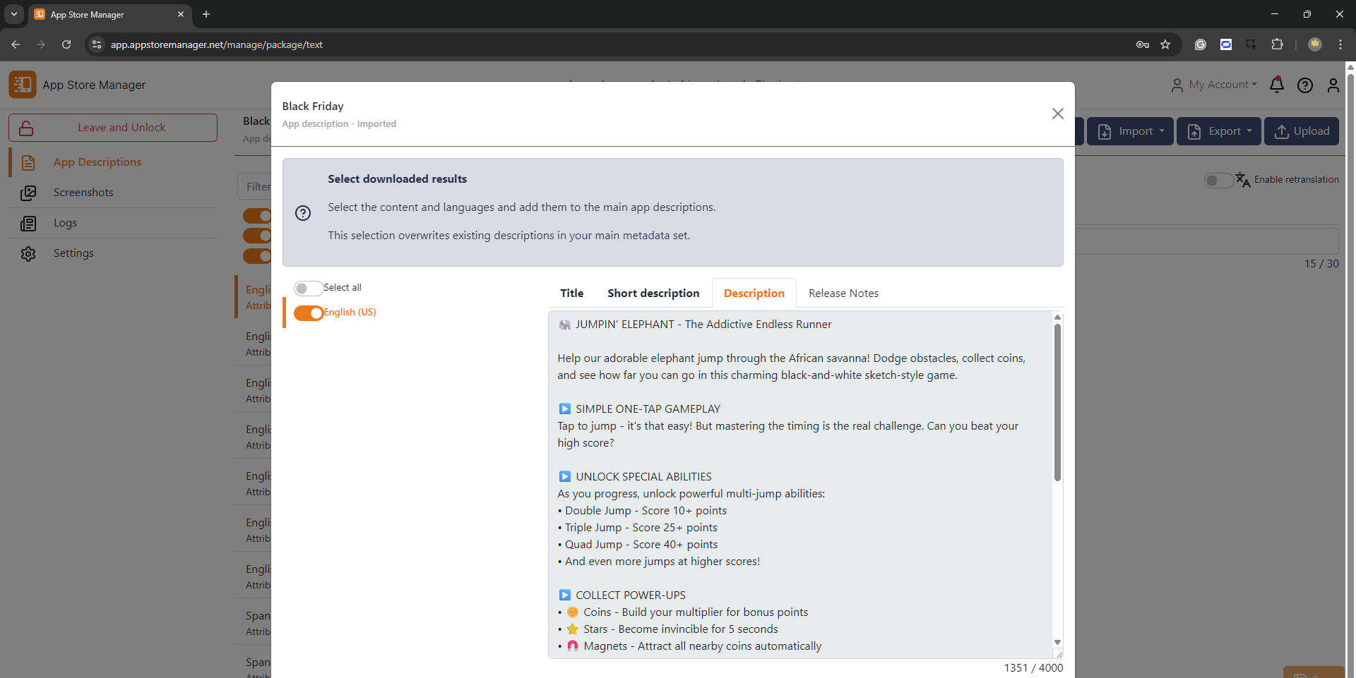 The store import allows a quick setup of an app and the existing descriptions. Then, with a few clicks, everything is loaded into the App Store Manager. It can be changed, adapted, supplemented, or even just archived.