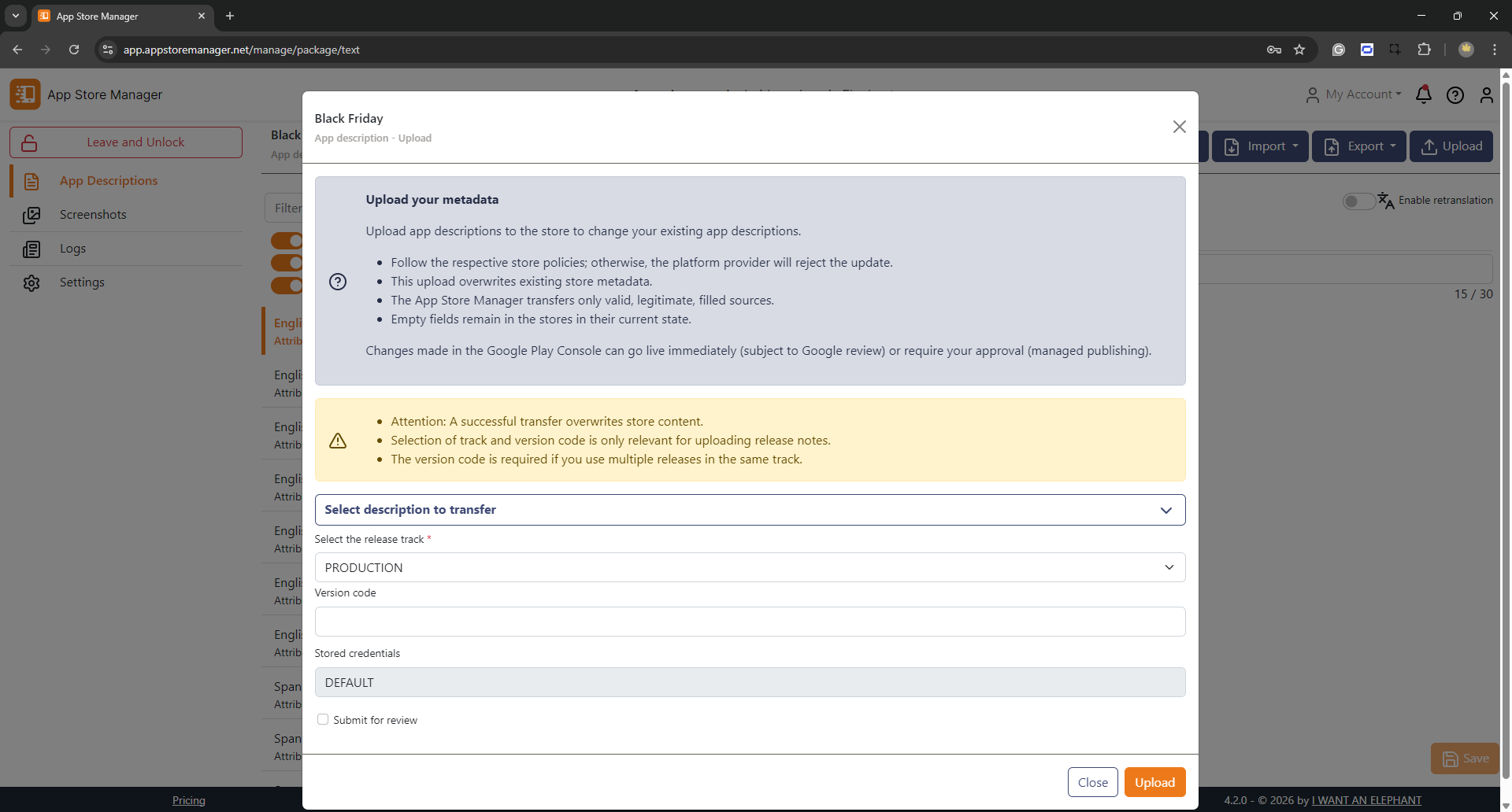 Now all translations are ready for upload in the App Store Manager. Select the "Upload" button and submit the credentials for the respective store.